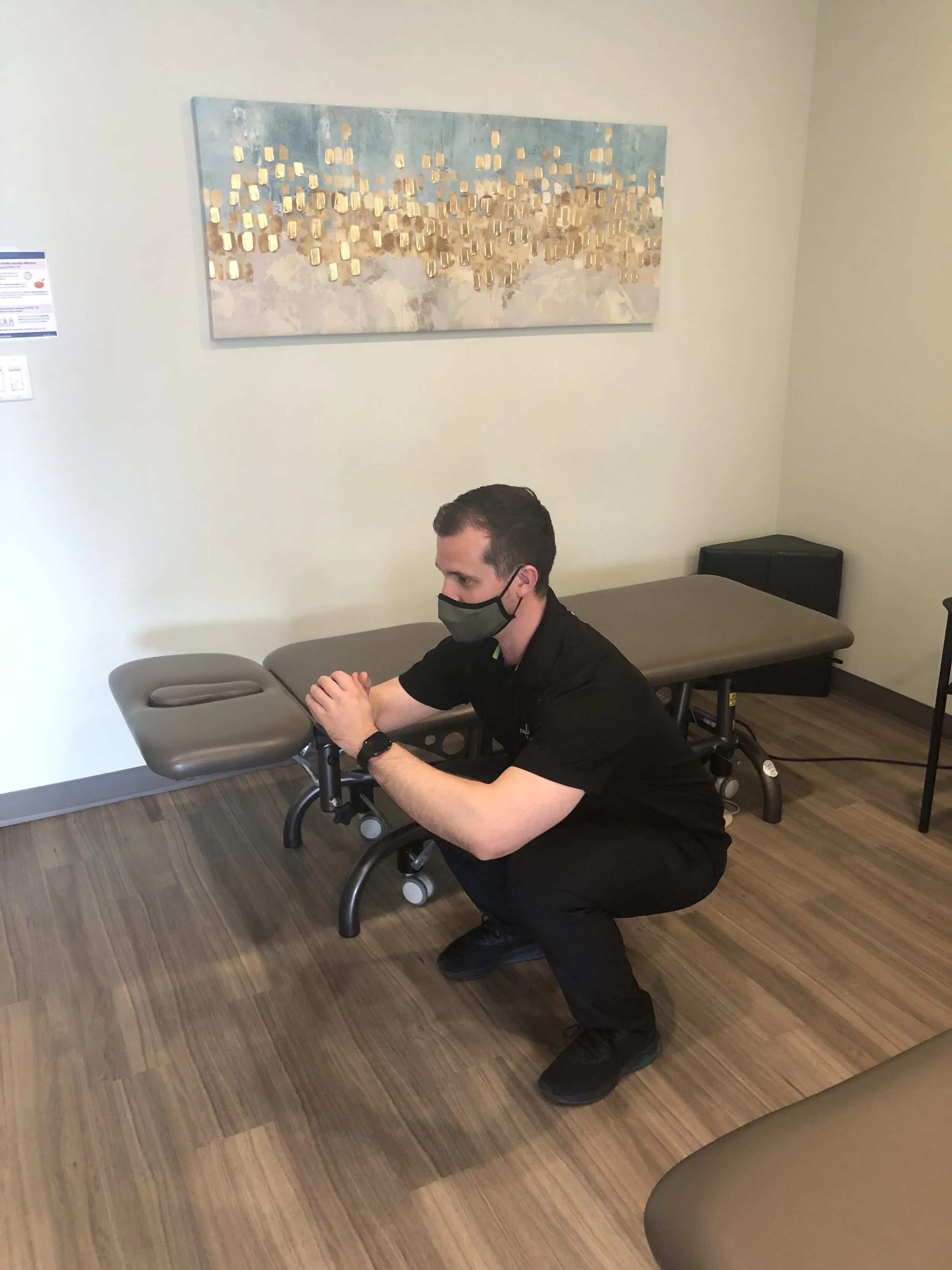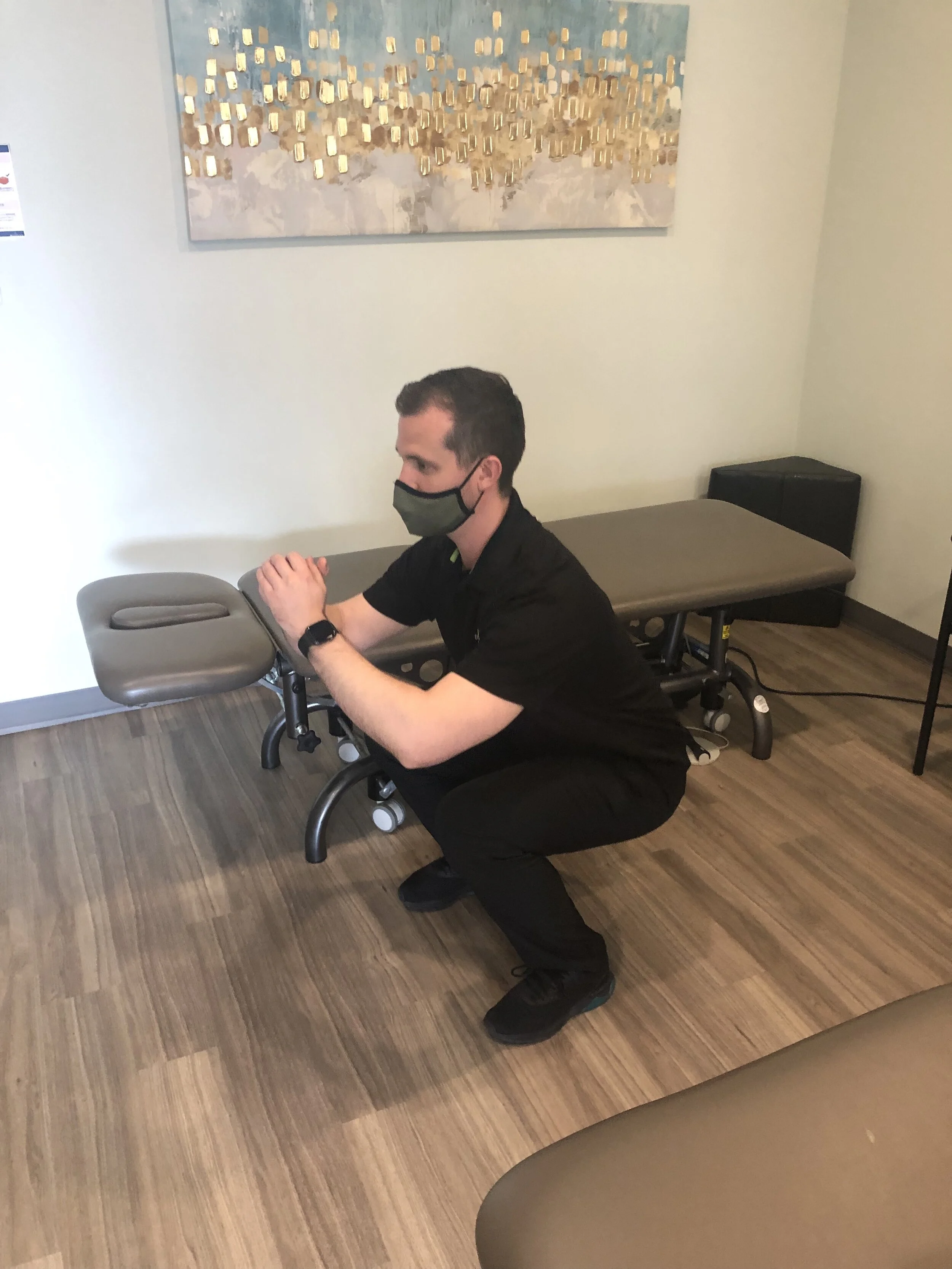 1) Squats - Along with helping with mobility, squats are a great functional way to strengthening your legs. The instructions are the same as above, but this time really think about tightening your abs and squeezing your glutes as you push back up into standing. Again, do 3 sets of 10 repetitions.